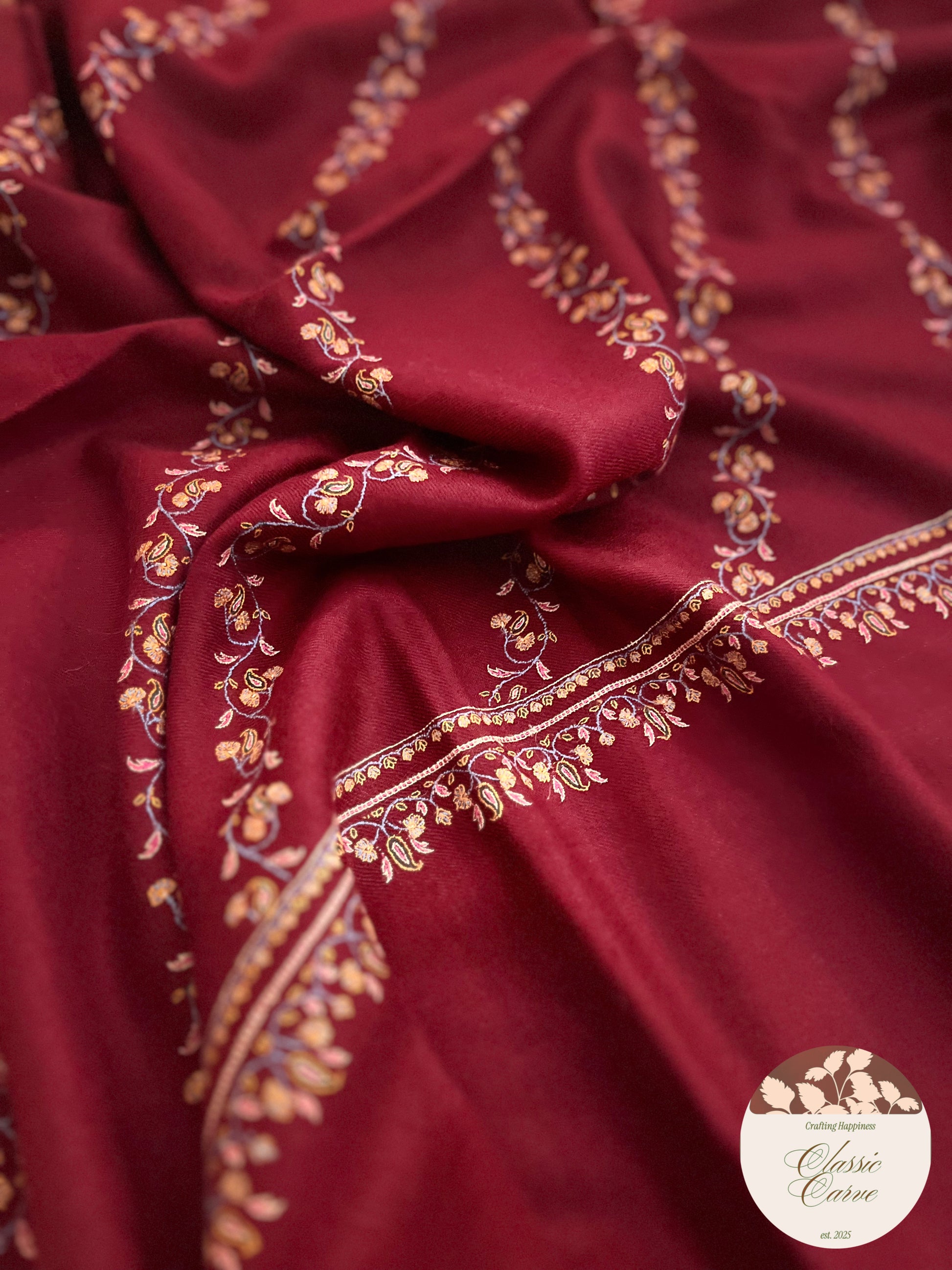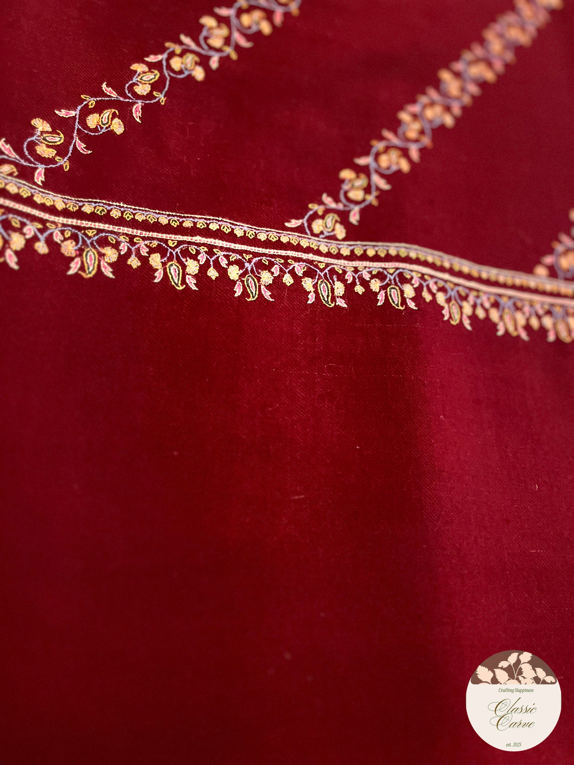 A poetic nod to its deep red base and floral embroidery, bold, feminine, timeless.A shawl that sings in silk whispers and Sozni dreams. Gulnaar , a garnet-red Pashmina, lined with fine floral vines in mustard, blush, and gold. Crafted for the quiet queens.