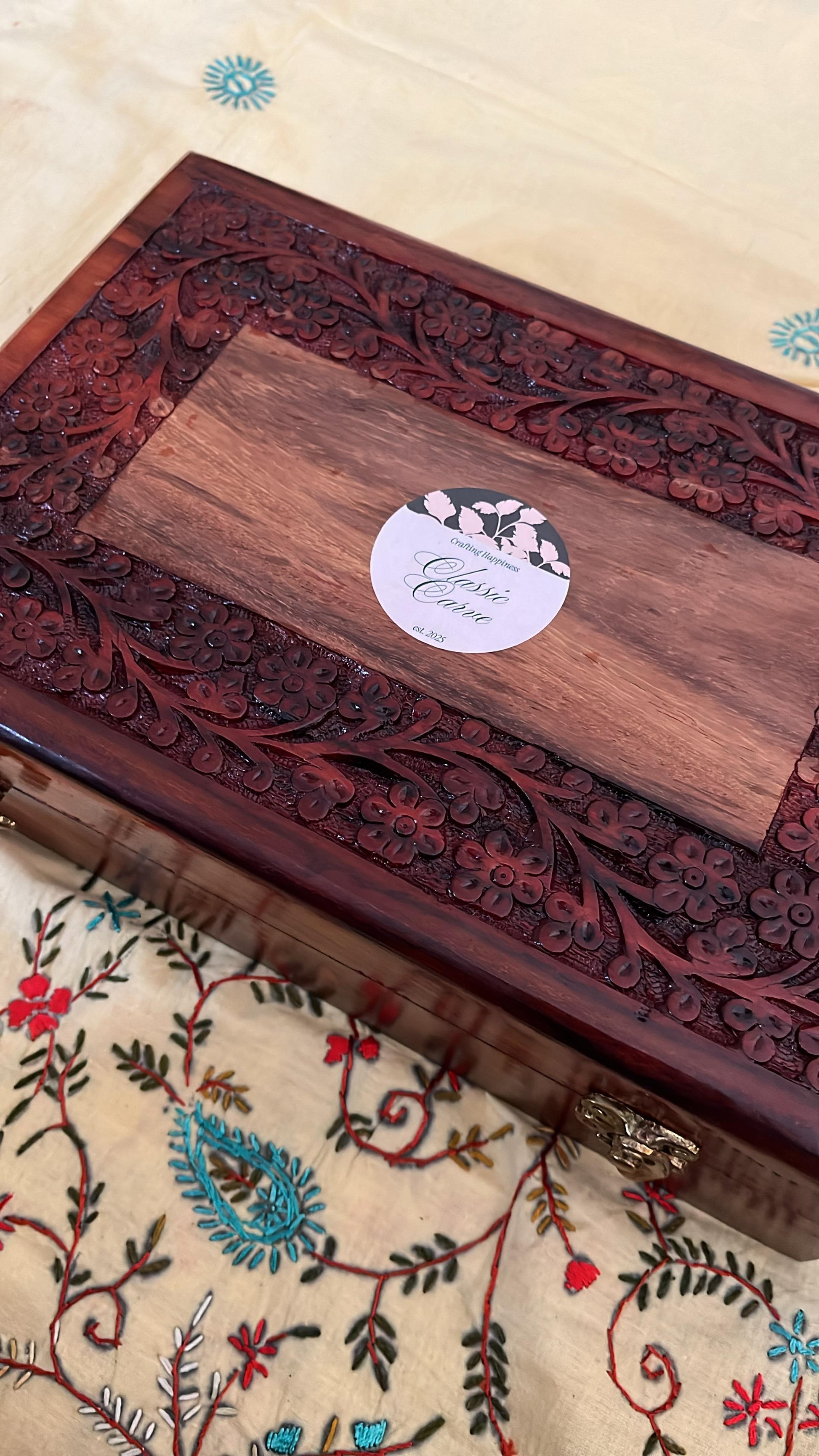 Crafted from rich Kashmiri walnut wood and adorned with intricate floral carvings, Sanduq-e-Khaas is more than a box — it’s a piece of legacy. Lined with plush red velvet, it is perfect for housing premium products like saffron, dry fruits, or heirloom gifts.